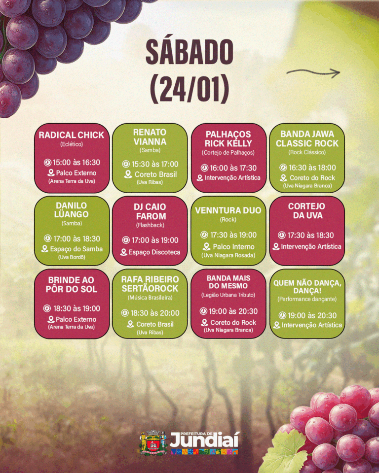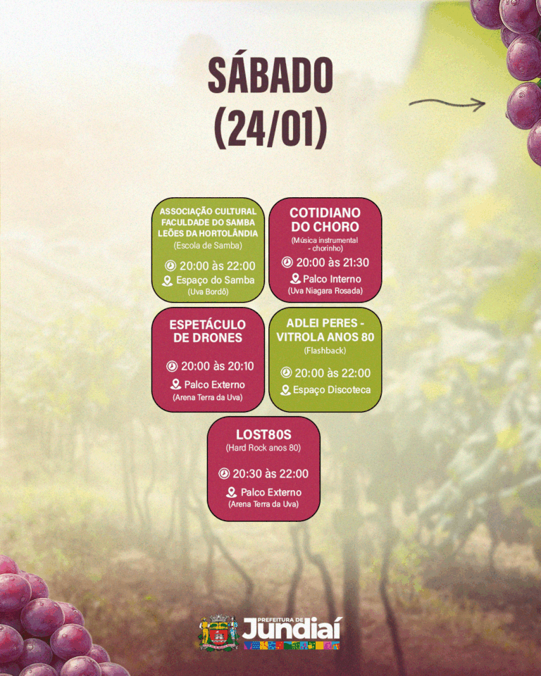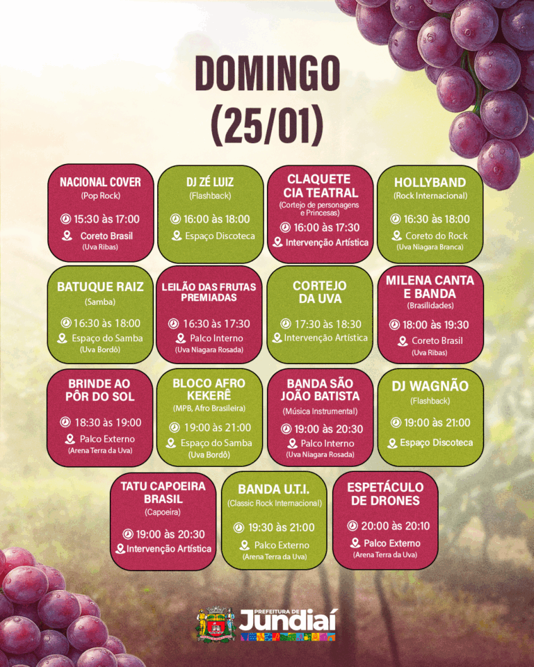 A programação gratuita da 41ª Festa da Uva e 12ª Expo Vinhos segue nos dias 23, 24 e 25 de janeiro; 30 e 31 de janeiro; e 1º, 6, 7 e 8 de fevereiro de 2026, com atrações culturais, experiências gastronômicas e atividades para toda a família.