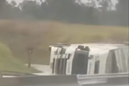 Um caminhão de carga tombou no início da tarde desta segunda-feira (23),…