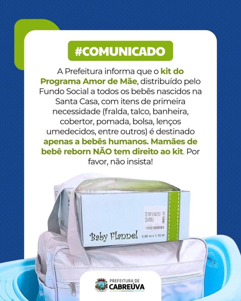 A Prefeitura de Cabreúva gerou repercussão ao publicar nas redes sociais um comunicado oficial esclarecendo que os kits de recém-nascido do programa “Amor de Mãe” não serão entregues às mães de bebês reborn — bonecos realistas que imitam bebês humanos. Segundo o comunicado, o kit, que inclui itens como fraldas, banheira, cobertor e lenços umedecidos, é destinado exclusivamente a mães de recém-nascidos reais atendidos pela Santa Casa do município.