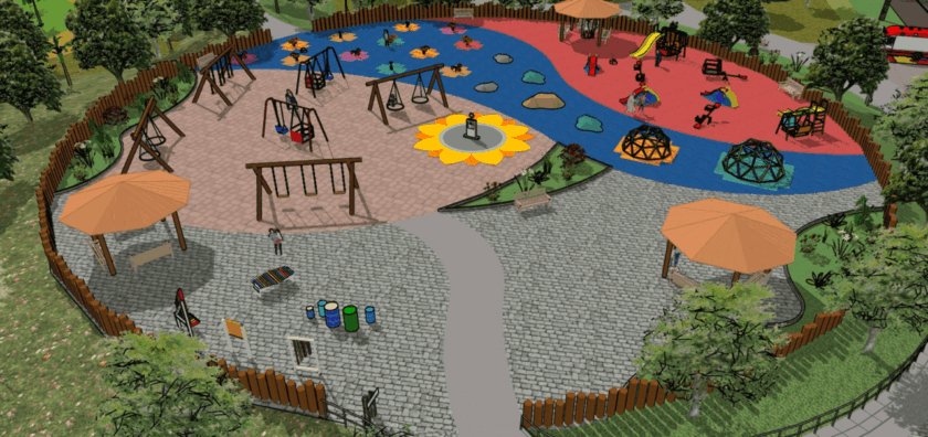 O espaço contará com trilha sensorial tátil e psicomotora, brinquedos sonoros de baixa intensidade com dissipação acústica pela vegetação, caixa de areia com brinquedos de movimento vestibular e psicomotor, jardim olfativo com plantas de cores suaves e aromas não agressivos, área de brinquedos psicomotores com piso emborrachado, brinquedos adaptados para PNE/PCD, brinquedos visuais e de sombra projetada, além de uma Casa de Apoio equipada com enfermaria e banheiros acessíveis e um Espelho d’Água para experiências e estímulos com a água.