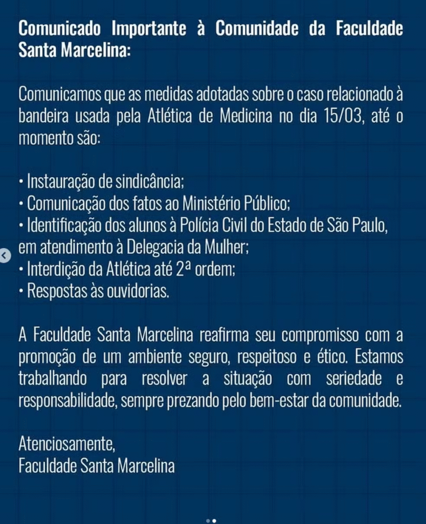 Segundo comunicado publicado nas redes sociais da faculdade, as medidas disciplinares foram decididas em primeira instância e fazem parte de um processo de apuração formal conduzido pela própria instituição. Além das punições individuais, a Associação Atlética Acadêmica envolvida no episódio permanecerá interditada por tempo indeterminado.