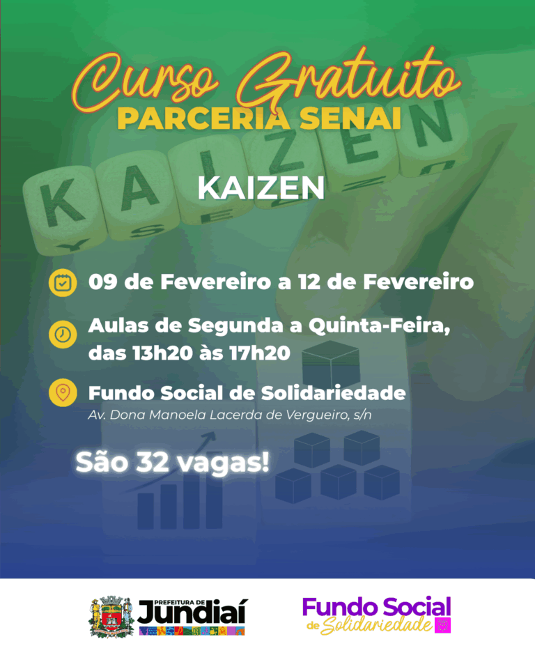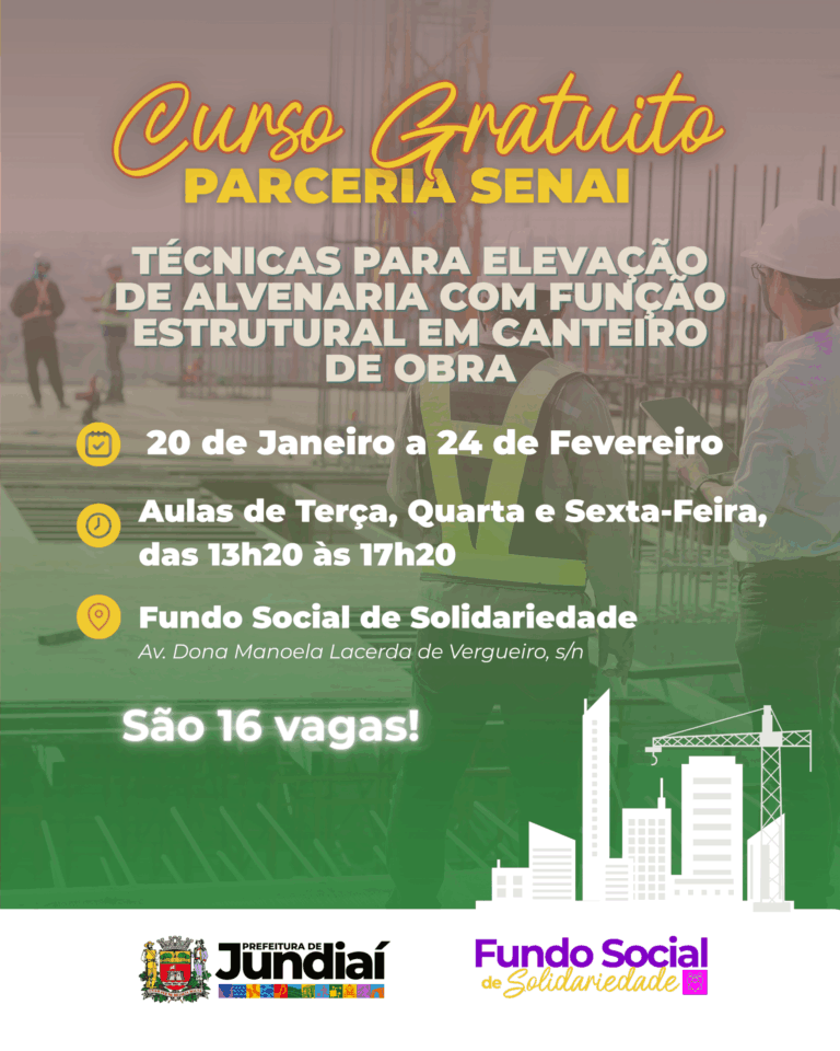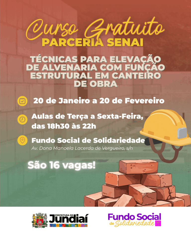 Que tal começar o ano aprendendo e se aprimorando com os cursos gratuitos do Fundo Social? A partir da meia-noite do dia 6 de janeiro de 2026 é possível se inscrever em capacitações que acontecem nos meses de janeiro e fevereiro. Os cursos são oferecidos em parceria com o SENAI, e têm como objetivo promover a geração de renda e o desenvolvimento profissional dos participantes.