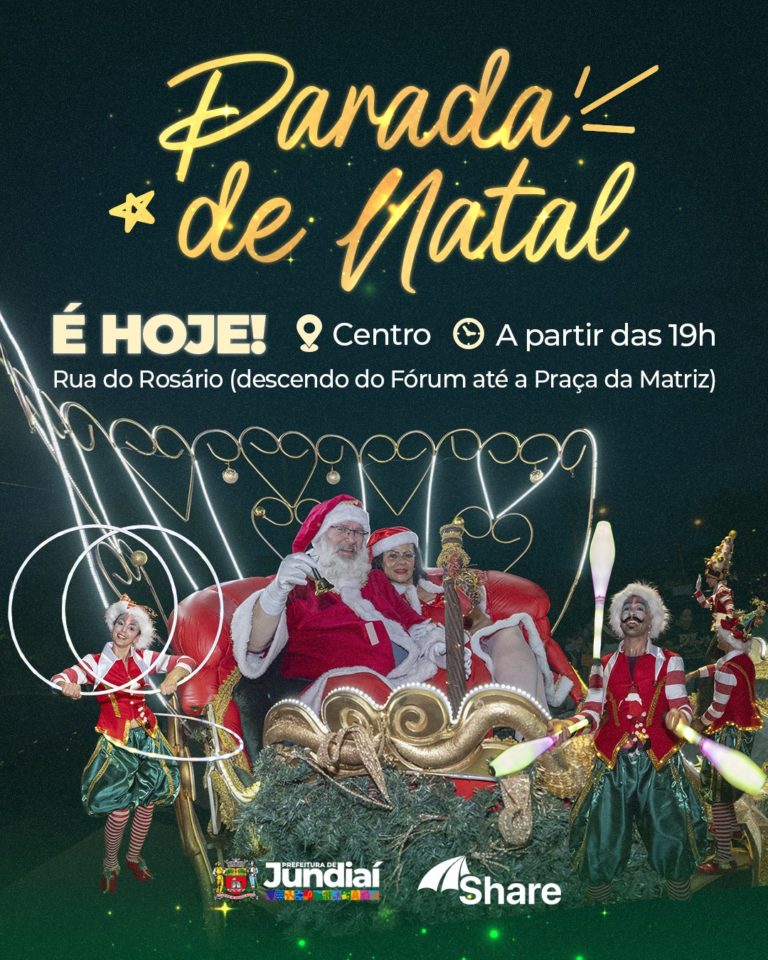 A Parada do Natal Encantado no Centro de Jundiaí, que aconteceria no último sábado (13), foi adiada em razão das condições climáticas e será realizada nesta segunda-feira (15), a partir das 19h, no Centro da cidade. O espetáculo terá início na Rua do Rosário, com o desfile seguindo do Fórum até a Praça da Matriz, prometendo encantar o público com arte, luzes e emoção.