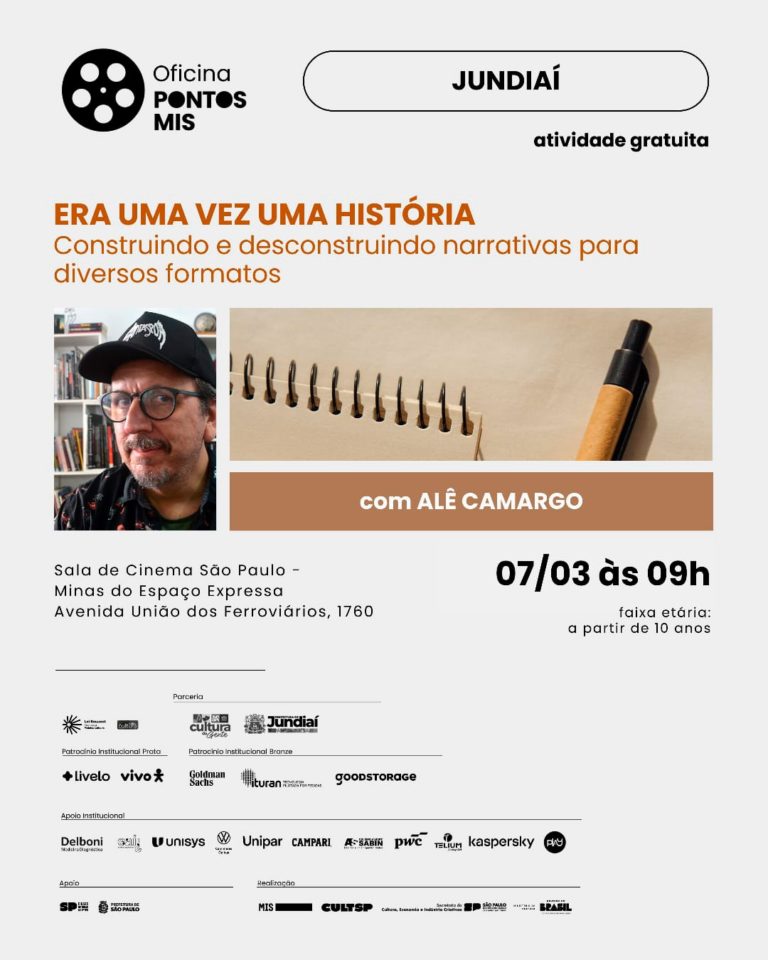 A oficina “Era Uma Vez Uma História”, do programa Pontos MIS, será realizada no dia 7 de março, das 9h às 13h, no Espaço Expressa, em Jundiaí, com a proposta de incentivar a criação de narrativas de forma acessível e estruturada. O encontro apresentará ferramentas práticas para que os participantes desenvolvam suas próprias histórias e será conduzido pelo premiado diretor e roteirista de animação Alê Camargo, responsável por curtas como “Os Anjos do Meio da Praça”, “A Ilha” e “A Noite do Vampiro”.