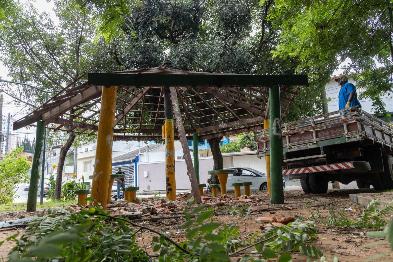 Funcionários da Secretaria de Infraestrutura e Serviços Públicos (SMISP) deram início a retirada das telhas e dos troncos de sustentação do quiosque. A base da estrutura, mesas e bancos permanecem e vão ganhar nova pintura, deixando o ambiente mais claro e seguro para quem frequenta o local.