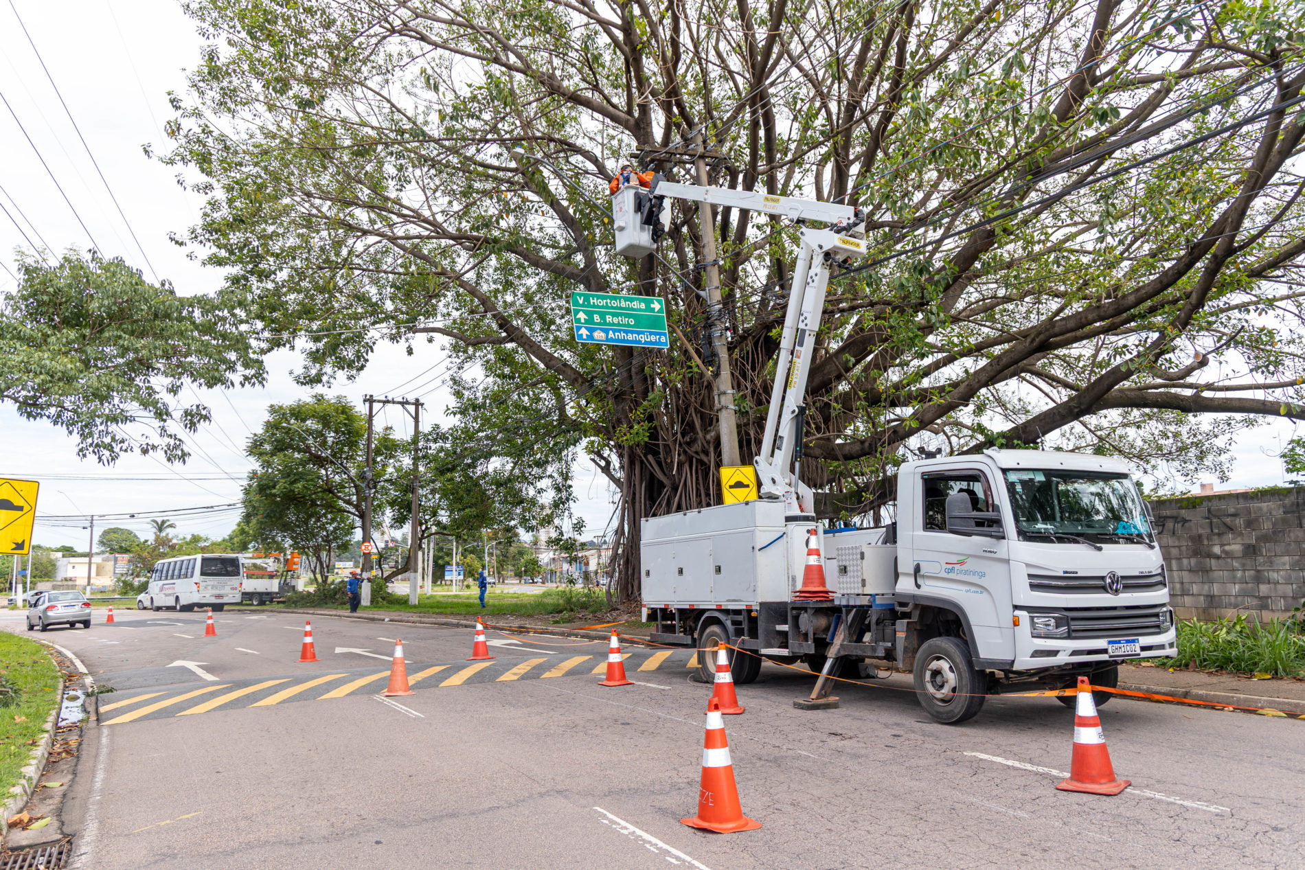 A Prefeitura de Jundiaí realizou a poda preventiva de uma figueira branca localizada na avenida Prefeito Luiz Latorre, na altura do bairro Vila Hortolândia. A árvore, com mais de 20 metros de altura, apresentava risco à fiação de 13 mil volts responsável pelo abastecimento de comércios e residências da região.
