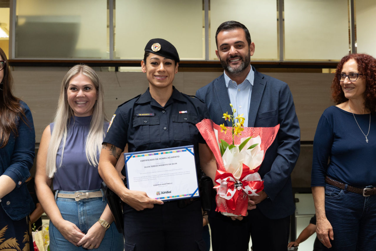 Em celebração ao Dia Internacional das Mulheres, a Prefeitura de Jundiaí realizou, nesta segunda-feira (9), uma homenagem às servidoras municipais. Durante a cerimônia, também houve uma homenagem especial à guarda municipal Silvia Modesto, que, mesmo em período de folga, interveio em uma ocorrência no último dia 6 de março e contribuiu para a detenção de quatro suspeitos após perceber uma movimentação suspeita na rua.