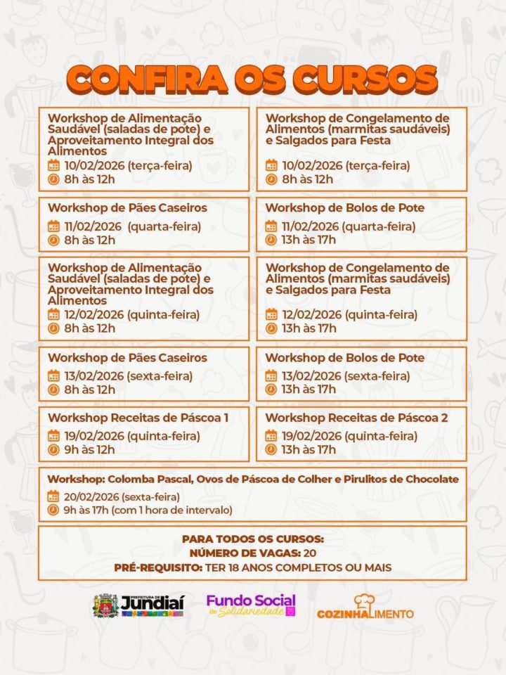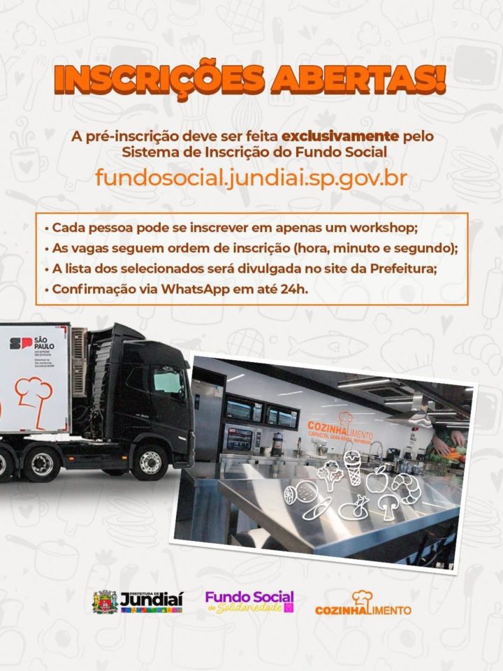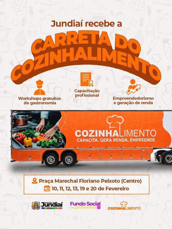 As inscrições para os workshops gratuitos da Carreta do Cozinhalimento seguem abertas. A ação itinerante voltada à capacitação profissional na área de gastronomia chega a Jundiaí na próxima terça-feira (10), na Praça Marechal Floriano Peixoto, atrás da Igreja Nossa Senhora do Desterro, no Centro.